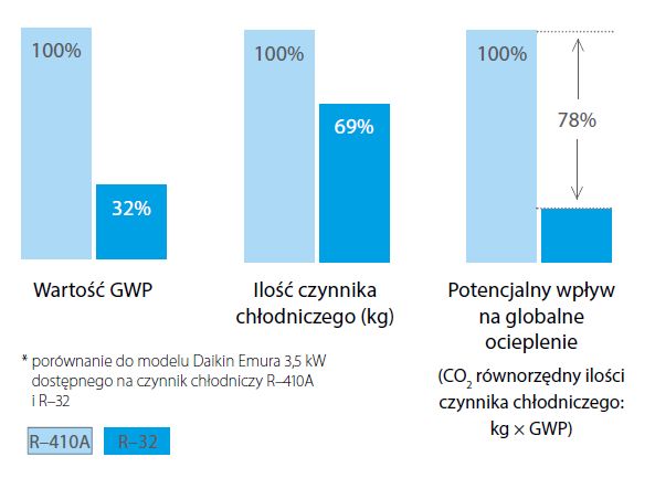 Jak widać korzyści z zastosowania w klimatyzacji czynnika R32 są znaczne. Na obniżoną wartość GWP (potencjał tworzenia efektu cieplarnianego) wpływa głównie obniżenie ilości czynnika chłodniczego, jaki jest stosowany w urządzeniu.